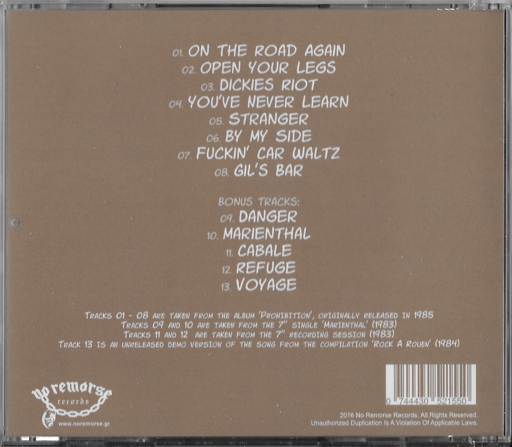 Jamais avares en bonus tracks, No remorse fournit aussi les 2 titres du 45T "Marienthal" de 1983, plus deux autres chansons enregistrées lors de la même session, mais finalement non retenues. Avec "Marienthal" et "Danger", nous sommes encore loin du hard bien fondé de "Prohibition" : Patrick Maineult se cherche en tant que chanteur et les deux compositions donnent dans un rock progressif / psychédélique assez maladroit et mou ("comédie musicale" sont les termes qui peuvent venir à l'esprit en écoutant ça). Dommage, d'autant que les morceaux écartés étaient beaucoup plus frondeurs : "Refuge" (longue plage solo instrumentale à la fin) et surtout "Cabale" (du pré-"Prohibition" de bonne facture).